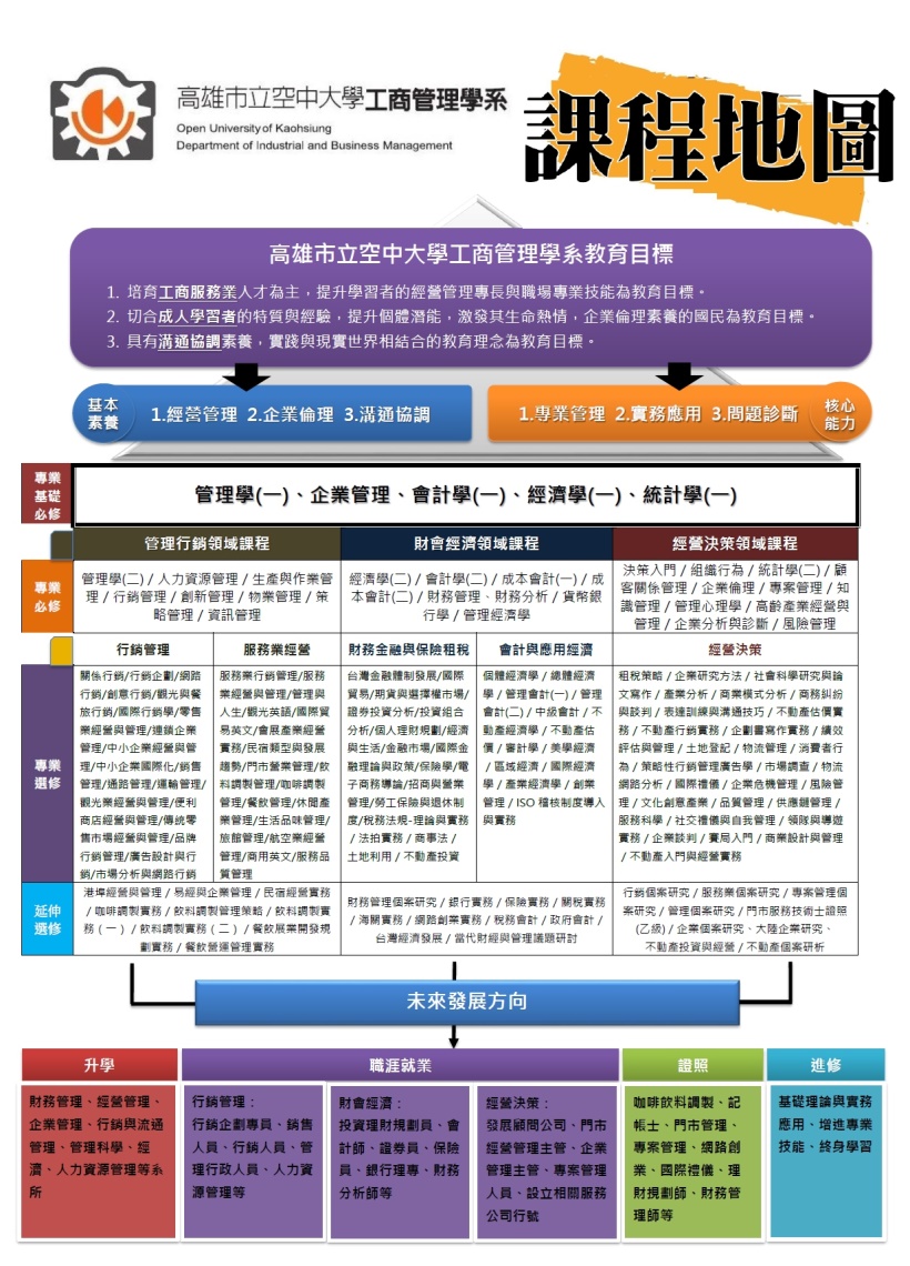 四、專業選修:分為「行銷管理」、「服務業經營」、「財務金融與保險租稅」、「會計與應用經濟」和「經營決策」等五類教學重點。同學可依自己的興趣集中某一個類別選修課程,亦可跨領域選修課程。