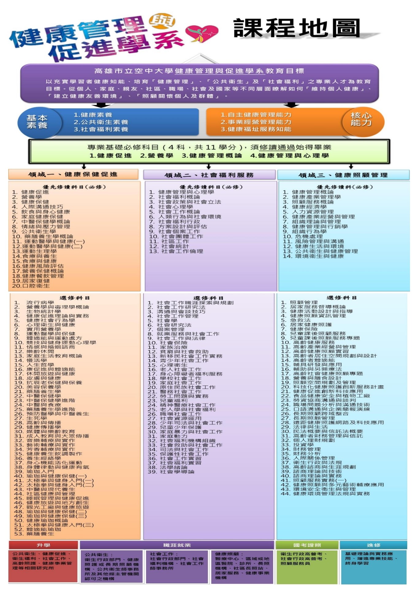 以充實學習者健康知能、培育「健康管理」、「公共衛生」及「社會福利」之專業人才為教育目標。從個人、家庭、親友、社區、職場、社會及國家等不同層面瞭解如何「維持個人健康」、「建立健康友善環境」、「照顧關懷個人及群體」。