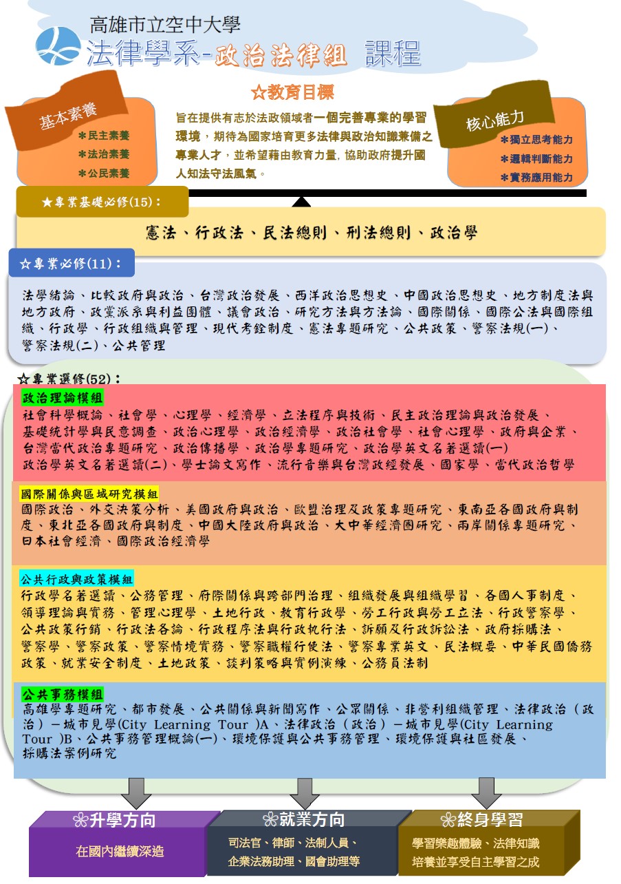 旨在提供有志於法政領域者一個完善專業的學習環境,期待為國家培育更多法律與政治知識兼備之專業人才,並希望藉由教育的力量,協助政府提升國人知法守法風氣。