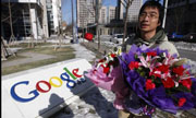 A Chinese Google user with a bouquet of flowers at the Google China headquarters in Beijing Photograph: Jason Lee/Reuters