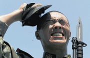 Drops of perspiration fall as a paramilitary policeman takes off his hat after finishing a training session at a military base in Jiaxing, Zhejiang province on Thursday. China's security services were accused Thursday of human rights violations.