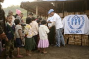 UN officials distribute aid to IDPs at Je Yang camp in Kachin state in December 2011 (Ryan Libre / DAA)