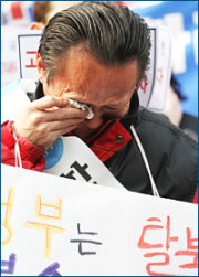 A North Korean defector wipes tears as he stands in a rally calling on China to stop repatriating North Korean defectors detained there in front of the Chinese Embassy in Seoul, Tuesday. / Yonhap
