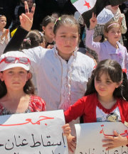 SEEKING PEACE: Girls hold signs and shout slogans against Syria's President Bashar al-Assad, in Bennish.