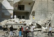 Civilians inspect the damage caused by a jet strike in the al-Meyasar district in Aleppo September 22, 2012.