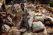 A young boy sits on a stack of ore sacks in the mining processing site in Bagega village.