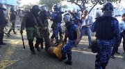 Police drag away a protester during the MDP protest on February 8, a day following the downfall of former President Mohamed Nasheed's government. FILE PHOTO