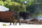 Kenyan police officers walk past the remains of burnt houses after an attack in Kibusu village in Tana River County of the Kenyan Coast on January 10, 2013. Inter-ethnic clashes in 2012 and early 2013 claimed about 180 lives.