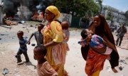 Somali women and children run from the scene of the suicide attack in Mogadishu on Sunday. Photograph: Mohamed Abdiwahab/AFP/Getty Images