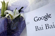 谷歌考慮撤出大陸一事,引發網路搜尋引擎市場可能重新洗牌的討論,未來百度、谷歌中國、騰訊搜搜和搜狗網的4分天下將可能轉變成3分天下;不過也有另一派人認為Google只是在向中國政府撒嬌,希望政府可以放鬆對網路資訊過濾的干涉。圖為支持Googled的民眾送花到Google北京辦公室加油打氣,而一旁也有網友嘲諷的貼上「Google 再見」。(美聯社)