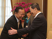 副總統蕭萬長(前右)30日在總統府,接見泰國學者Krasae Chanawongse(前左)等一行,歡迎他們來台訪問
