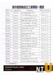 以教育為根基迎向新工會時代 教師加入工會大家庭,邁向勞動團結新紀元 落後的法令無法阻擋社會進步 保障各業受僱者組織工會載明於各項國際公約,台灣的教師卻被落後的國家法律下達禁令,時間竟然超過一甲子,2002年,在全國教師會的帶領下,十萬教師以「團結」、「尊嚴」、「協商」、「工會」為訴求,向政府與社會表達組織工會的決心。 九年來,在各界鍥而不捨的努力下,立法院繼通過《兩公約暨其施行法》之後,自民國18年制定以來即禁止教師組織工會的《工會法》,也終於在去年6月1日完成三讀修正,並將在今年五一勞動節正式解禁,補足了六十多年來的人權空白,證明落後的勞動法令,終究無法永遠禁錮社會進步,也標誌著台灣的人權保障進入新的里程。 教師為什麼要組織工會? 教師之所以決心組織工會,除了免於讓台灣自外於國際人權潮流的困窘外,在十多年的教師會運作經驗中,也已證明一個缺乏勞動三權保障的教師組織,難以提昇教育決策品質,甚至無力確保孩子的適性教育。從北北基執意實施一綱一本與自辦基測,從原台北縣政府不惜違反教育法制違法加課,從扭曲的五年五百億「邁向頂尖大學計畫」,從許許多多荒腔走板的教育政策中,在在顯示,台灣需要一個專業又有力量的教師工會。 教師工會的任務~誓言以教育專業為本 作為受僱者團結組織,工會當然必須維護、增進會員權益,然而,基於教育的公共屬性,基於教職面向學生的工作特性,未來教師工會除了團結全體教育人員,更將致力優化教育決策品質、維護學生受教權益、激勵教師專業,教師工會將以實際行動證明:教師工會不僅是教育人員的團結組織,更是台灣最專業的教育團體,教師誓言以具體行動提昇教育品質,以專業實現我們對台灣教育的願景。 各地教師工會組織現況 各級公、私立學校教師目前正積極進行教師工會之籌組,預計五一勞動節當天就有17個縣市教師工會成立,至五月底,則會有20個縣市成立教師工會,全國性的教師工會聯合會則將視各基層工會組織情形,預計今年七月左右正式成立,最遲於今年九二八教師節前成立。目前據本會初步統計,大高雄市教師加入原縣、市教師會所組工會已達原教師會總數,另外,新北市教師工會也在短短期間內入會超過一萬人,我們可以這麼說:老師沒有要不要加入教師工會的困擾,只有何時加入的問題。全國教師會竭誠歡迎還沒有加入教師工會的教育人員踴躍先加入服務地縣市教師工會,共同開創台灣教育新紀元。 台灣教師工會的社會責任 公私立各級學校教育人員約有30萬人之多,作為素質整齊的專業社群,教師工會必須善盡其社會責任,未來除致力推動勞動教育的課程化、建立親師生完整勞動意識,更將結合各進步社團力量,完備勞動法制、監督公共政策,俾能提升台灣勞動人權,早日落實公民社會。 附表:各地教師工會成立日期、入會聯絡電話、住址。 名詞說明:依工會法規定,教師不得組織企業工會,所以,縣市教師會轉型之工會名稱目前有「教育產業工會」、「教師職業工會」與「教師工會」幾種,我們通稱為教師工會,未來全國教師會組織之工會名稱則為「全國教師工會總聯合會」,簡稱「全教總」。 (2011-4-24/苦勞網)
