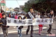 《反土徵惡法》苗縣200農民 上街抗議 〔自由時報記者何宗翰/頭份報導〕苗栗後生會昨天舉辦「反土徵公民大遊行」,號召兩百名農民走上街頭,抗議剛通過的「土地徵收條例」,並前往國、民兩黨苗栗縣第二選區立委候選人競選總部,希望他們簽署承諾書,承諾當選後推動修法。民進黨候選人楊長鎮簽署支持;國民黨候選人徐耀昌則由競選總部執行長陳永賢出面迎接,但未簽署。 遊行負責人邱星崴說,這次遊行是為了抗議兩週前通過的行政院版「土地徵收條例」,內容不符合民間版所提的「保護優良農地」、「評估公益性、必要性」、「建立實質人民參與機制」、「落實完全補償」、「建立安置規範」、「矯正區段徵收惡法」等六大原則。 楊長鎮:大埔事件不重演 參與遊行的後龍灣寶社區發展協會理事長洪箱說,看到年邁農民頂著寒風上街遊行,心裡很不捨,政府應該留下良田,讓台灣後代子孫有一口飯吃。 昨天共有竹南大埔、卓蘭白布帆、三灣外環道自救會、三灣反鄉公所徵收自救會、南庄石壁、東河部落反高壓電塔自救會等團體參與,抗議群眾集結在頭份下公園前,由清大人類所學生演出行動劇,隨後出發,先到民進黨立委候選人楊長鎮的競選總部遞交承諾書,楊長鎮同意簽署,他認為土地徵收不應過度浮濫,過程必須尊重農民權益,承諾當選後保證不讓大埔事件再度發生。 徐耀昌陣營:修改後再簽 抗議隊伍接著轉往徐耀昌競選總部,執行長陳永賢出面迎接但未簽署,他表示,同意民間版土徵條例的六大原則,但認為承諾書上「終止徵收農地」、「不再推動土徵」的職權屬於行政權,而非立委職權,修改後再簽較為合適。 陳永賢也回應白布帆農民對興建高污染太陽能發電廠的疑慮,表示會以縣議員身分監督,但說法引起抗議群眾不滿,憤而離去。 (2011-12-25/自由時報)