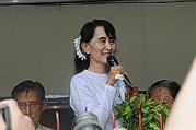 緬甸民主運動領袖翁山蘇姬(中)2日到全國民主聯盟政黨總部與選民見面,在大門前感謝選民支持,並呼籲選民繼續為民主努力。
