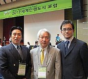 高雄市人權委員會委員朱立熙(中)16日在韓國光州市出席2012年世界人權都市會議,高雄市社會局長張乃千(左)、台南市政府副秘書長劉建忻(右)同行。(圖片由朱立熙提供)