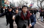 為響應中東、北非等地「茉莉花革命」,中國網友也發起「中國茉莉花」抗爭行動,圖為北京民眾遭到公安驅趕的畫面。圖片來源:達志影像/路透社資料照片。