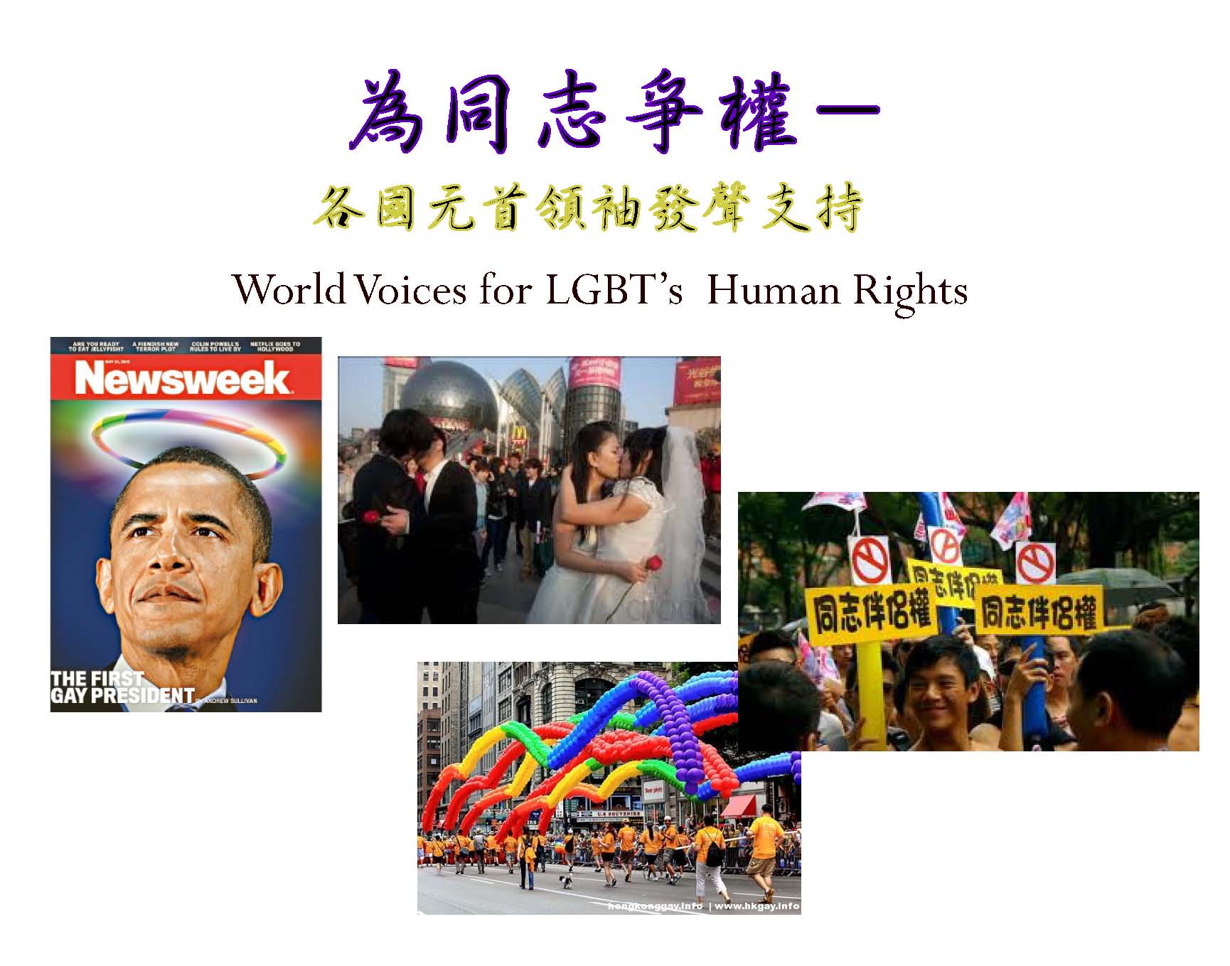 為同志爭權-各國元首領袖發聲支持World Voices for LGBT’s Human Rights 2012年5月9日,美國總統歐巴馬(Barack Hussein Obama)接受美國廣播公司(ABC) 採訪,首次表明支持同性婚姻的態度,成為首位公開支持同性婚姻合法化的美國總統 。2011年12月歐巴馬曾於聯合國日內瓦總部發表演說宣示,美國政府將積極對抗其他 國家踐踏同性戀權益的行徑,包括將同性間的性行為入罪、虐待男女同性戀者、雙性 戀或跨性別人士,或漠視這些人受到的虐待。歐巴馬表示目睹同性戀幕僚嚴守一夫一 妻制關係,共同撫養孩子;同志軍人在同志禁令解除後仍感約束等現象,促使其改變 想法,轉而支持同志婚姻。 美國總統歐巴馬支持同志婚姻在國際間引起了極大迴響。紐西蘭的總理凱伊 (John Key)打破沈默,聲稱個人並不反對同性結婚。法國總統當選人歐蘭德 (Francois Hollande)也推動同志婚姻合法化;公開出櫃的德國外長威斯特威勒 (Guido Westerwelle)公開讚揚歐巴馬的決定;古巴總統勞爾.卡斯楚(Raul Castro) 之女瑪莉耶拉(Mariela Castro)表示,卡斯楚支持同志擁有更大權利。 儘管亦有批評聲浪,但目前包括美國六州和華盛頓特區、加拿大、阿根廷、南非 及歐洲數國已承認同性婚姻合法化。比利時、丹麥、芬蘭、德國、冰島、荷蘭、挪威、 西班牙、瑞典和英國允許同性戀者收養小孩,法國總理艾羅(Jean-Marc Ayrault)亦 表示將向國會提交議案,爭取通過同性戀婚姻合法化、批准同性戀「夫婦」收養孩子。 (2012-07-19/ 人權學堂)