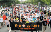 你好大我不怕 9千人遊行反媒體壟斷 近九千名聲援學生及學界、媒體界及藝文界等民眾,在昨天九一記者節,為「反媒體壟斷」走上街頭。隊伍在中國時報大樓集結,沿途發出「你好大、我不怕」的聲浪,隊伍走了六公里,最後抵達國家通訊傳播委員會(NCC)遞交陳情書,要求修法制定反跨媒體壟斷法,還給媒體真正的第四權。 七月下旬,旺中併購案引發各界對媒體壟斷的擔憂,隨旺中集團旗下媒體對「走路工」與學者黃國昌事件大篇幅報導,近百個民間團體昨天發起「九○一反媒體壟斷大遊行」。下午二時不到,位於艋舺大道的中國時報大樓前擠滿人潮,頂著烈陽,公民團體拉著「反媒體巨獸」布條,學生舉著「蔡董退位、媒體無罪」等標語,連狗狗身上都掛著「我要汪汪、不要旺旺」牌子響應。 遊行總指揮、記協會長陳曉宜及學者管中祥,在遊行出發前遞交「抗議書」,旺中媒體公關處長李宜軒(中視前主播李玲)代表旺中集團接下。 台大新研所教授張錦華、台大哲學系教授林火旺、作家馮光遠及人權作家張娟芬,都站上宣傳車上發言。二時一到,隊伍兵分三隊出發,電影導演王小棣、第一波辭職的前中時記者游婉琪等人,都隱身在遊行隊伍當中,還有多位國外教授。許多大學生頭綁黃絲帶、沿途呼口號,隊伍步行約三小時後,抵達NCC,由傳播內容處長何吉森代表接下陳情書。 陳曉宜表示,旺中併購案最可怕的是,一旦它掌握全台三分之一以上的收視戶,壟斷系統平台的後果,就是讓全台有線電視台不敢得罪旺旺,讓台灣電視台只剩下一種聲音。 遊行發言人管中祥說,十八年前自立報系為爭取新聞自主,員工發起「搶救自立」為新聞自主而走大遊行,當時有五百人參與;昨天有九千人站出來,人數比十八年前多了十八倍,代表全台人民反媒體壟斷、要新聞自由、要專業聲音,也創下媒體議題成公民運動首例的遊行。 (2012-09-02/聯合新聞網)