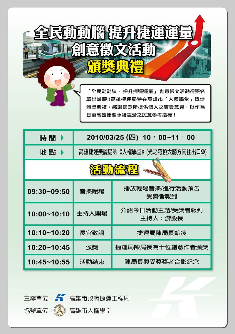 「全民動動腦, 提升捷運運量」 創意徵文活動得獎名單出爐嘍!!高雄捷運局特在高雄市「人權學堂」舉辦頒獎典禮,感謝民眾所提供個人之寶貴意見,以作為日後高雄捷運永續經營之民意參考指標!!