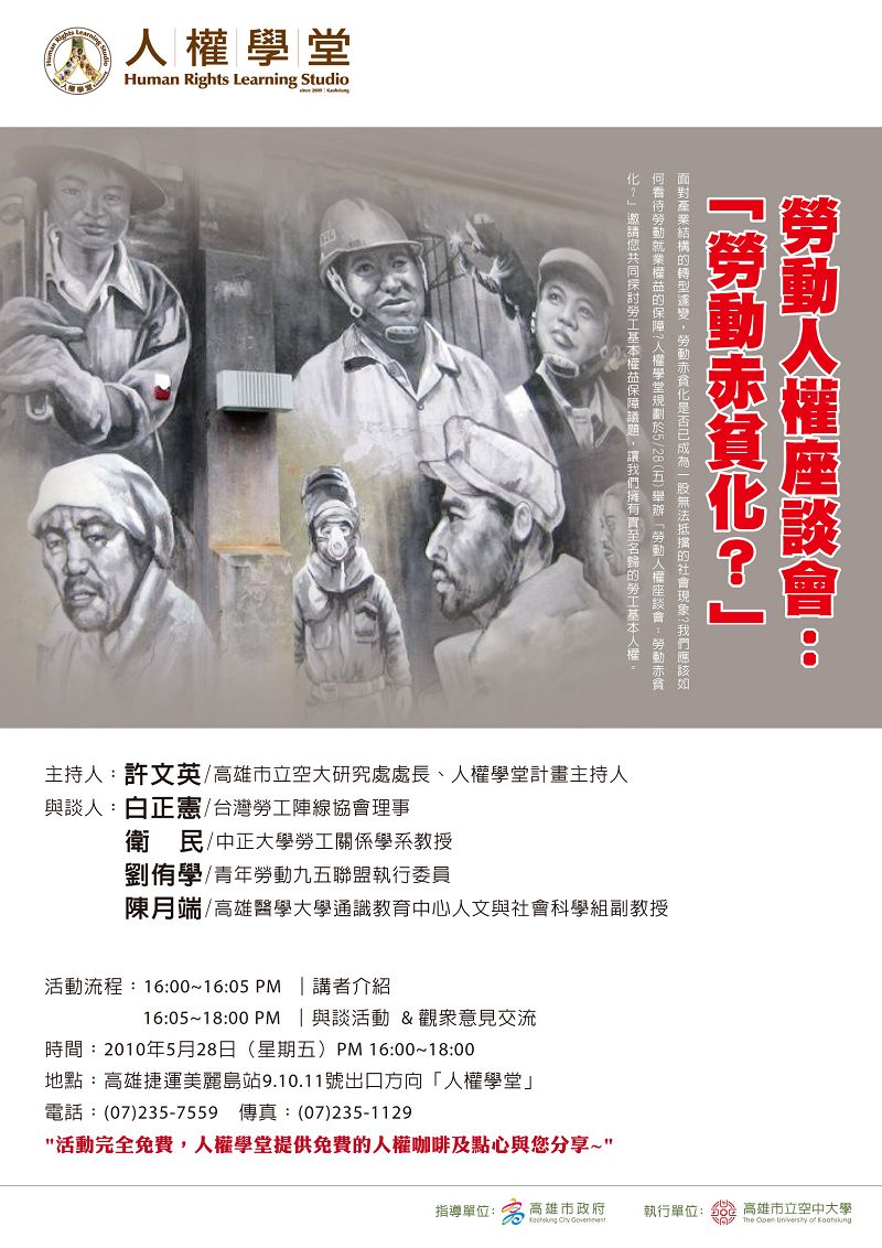 面對產業結構的轉型遽變,勞動赤貧化是否已成為一股無法抵擋的社會現象?我們應該如何看待勞動就業權益的保障?人權學堂規劃於5/28(五)舉辦勞動人權錄影座談會:「勞動赤貧化?」邀請您共同探討勞工基本權益保障議題,讓我們擁有實至名歸的勞工基本人權。