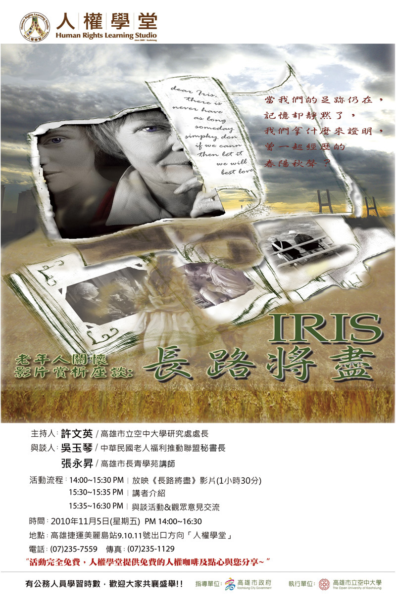 在現實生活中,人漸漸面臨生老病死的過程。『衰老』是一個奧秘,正如『生命』本身就是一個極大的奧秘。在本片「長路將盡」中,我們將可看見女主角艾瑞絲,從一個創作力非常豐沛,在歷經歲月更迭下得到阿茲海默症,在罹病的過程中,失憶和失語以及過去和現在之時間的瓦解。本片根據約翰貝理所撰寫的「輓歌─寫給我的妻子艾瑞斯」一 書所改編,在電影播映結束後會與專家學者討論相關議題,如:在我國醫療照護上,對於老人照護是否足夠完善?由於目前我國現在已逐漸進入高齡化社會,面對此大環境的改變,在社會醫療各項老人福利措施上,有什麼需要改善的地方?參考國外高齡化社會中,國內老人各項權益保障提昇,有哪些尚需要加強的地方?邀請您共同來關心老人的權益議題。