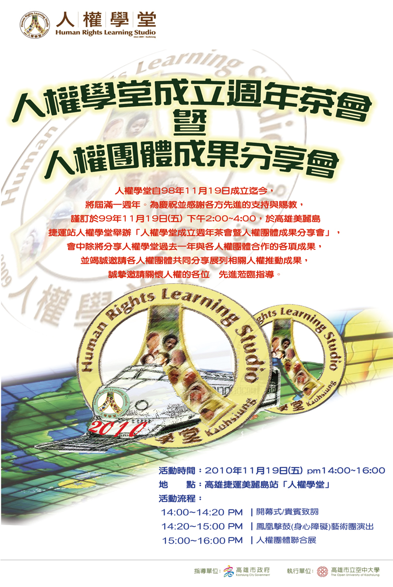 人權學堂自98年11月19日成立迄今,將屆滿一周年。為慶祝並感謝各方先進的支持與賜教,謹訂於99年11月19日(星期五)下午2:00~4:00,於高雄美麗島捷運站人權學堂舉辦「人權學堂成立周年茶會暨人權團體成果分享會」,會中除將分享人權學堂過去一年與各位人權團體合作的各項成果,並竭誠邀請各人權團體共同分享展列相關人權推動成果,誠摯邀請關懷人權的各位 先進蒞臨指導。