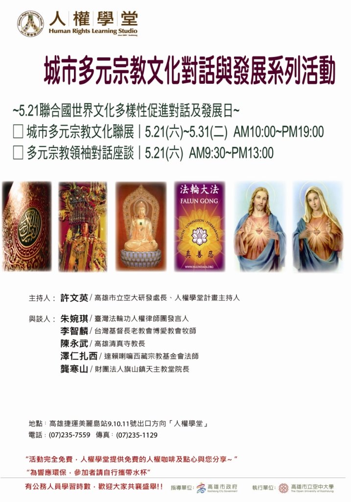5/21為聯合國訂定的「世界文化多樣性促進對話及發展日」,高雄素有「宗教聯合國」之稱,為響應多元宗教文化對話與發展,人權學堂謹訂於100年5月21日(六)-5月31日(二),規劃「城市多元宗教文化聯展 」,邀請各宗教團體共同於高雄捷運美麗島站人權學堂一同駐展宗教文化相關文物及影像資料,提供社會民眾、旅客遊子們,有機會認識、了解,並進一步學習尊重台灣多元宗教文化與其發展歷程。