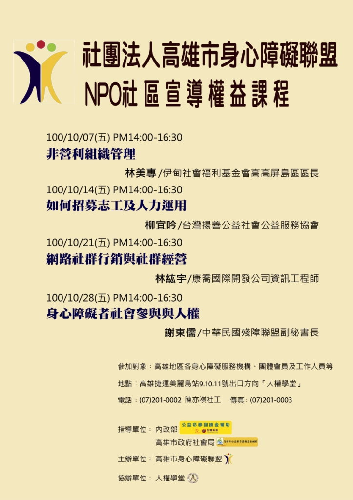 10/7-28:社團法人高雄市身心障礙聯盟-NPO宣導權益課程
