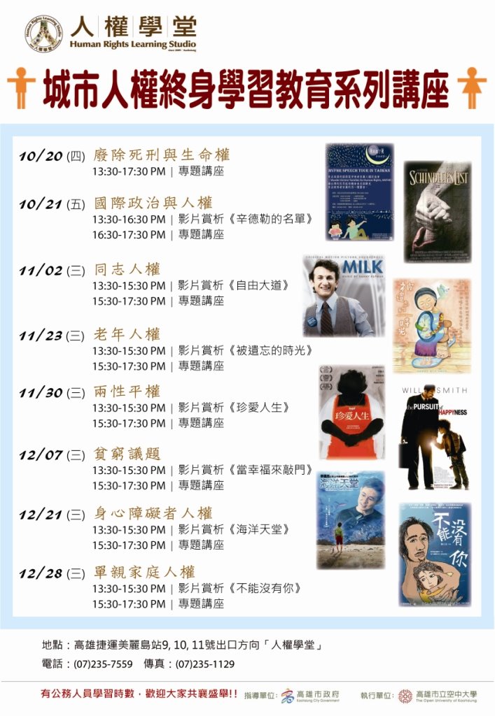 為鼓勵民眾終身學習,人權學堂特地規畫城市終身學習人權系列講座,以平易化方式讓民眾了解人權與民眾的生活密切性,讓城市居民樂於了解人權、學習人權、享受人權,活動透過人權影片觀賞並邀請不同人權領域的學者專家進行人權專題講座,以期人權教育能於城市居民心中紮根。
