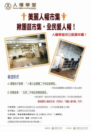 11/19為人權學堂成立兩週年紀念日,為感謝社會各界對於城市人權社會教育的支持與協助,也為了將人權的理念更加平民化、生活化、實踐化,人權學堂謹訂於11月19(六)、20(日)兩天,在高捷美麗島站人權學堂舉辦「美麗人權市集:揪團逛市集,逗陣愛人權!」活動,提供「人權資源需求交換平台」,由各人權團體、民眾、學生進行二手物品義賣活動,匯集社會資源共同推動人權。所有二手物品由義賣捐贈者自訂標價,於徵得捐贈者同意下,標示捐贈者姓名,以資感謝。