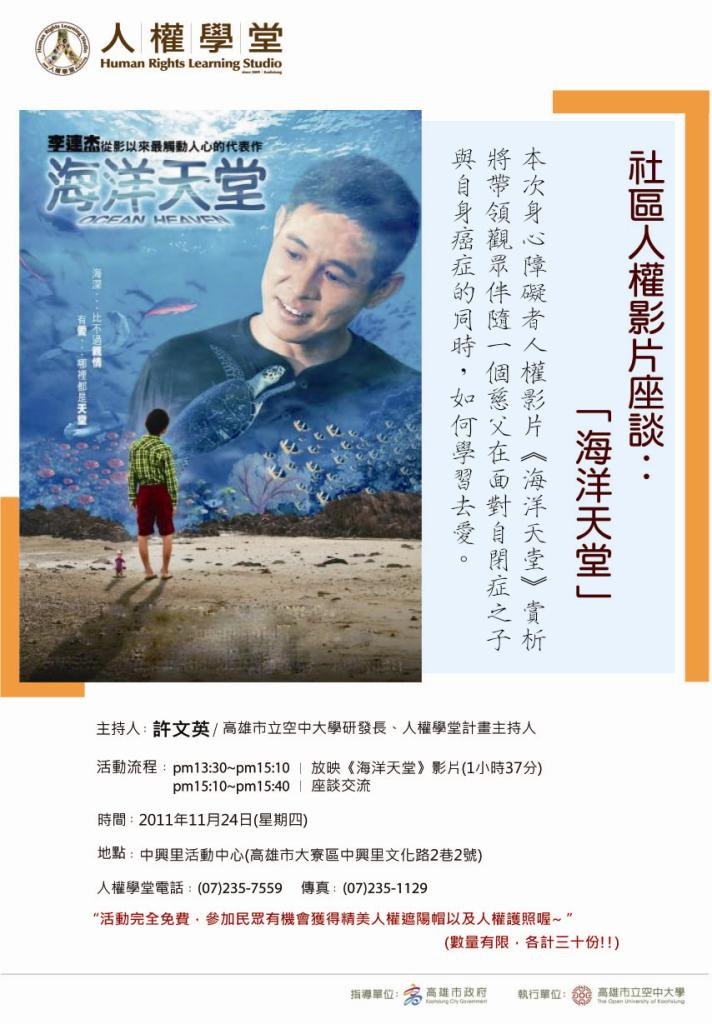 本次身心障礙者人權影片《海洋天堂》賞析將帶領觀眾伴隨一個慈父在面對自閉症之子與自身癌症的同時,如何學習去愛。本片映後將討論相關議題,如:身心障礙者及其家庭在台灣的權益處境為何?其權益保障面臨哪些困境與挑戰?政府應如何加強、改善及促進身心障礙者的相關權益保障措施?民眾可以進行哪些維護身心障礙者人權的行動?參考國外對於身心障礙者的權益保障,有哪些可供我們借鏡之處?