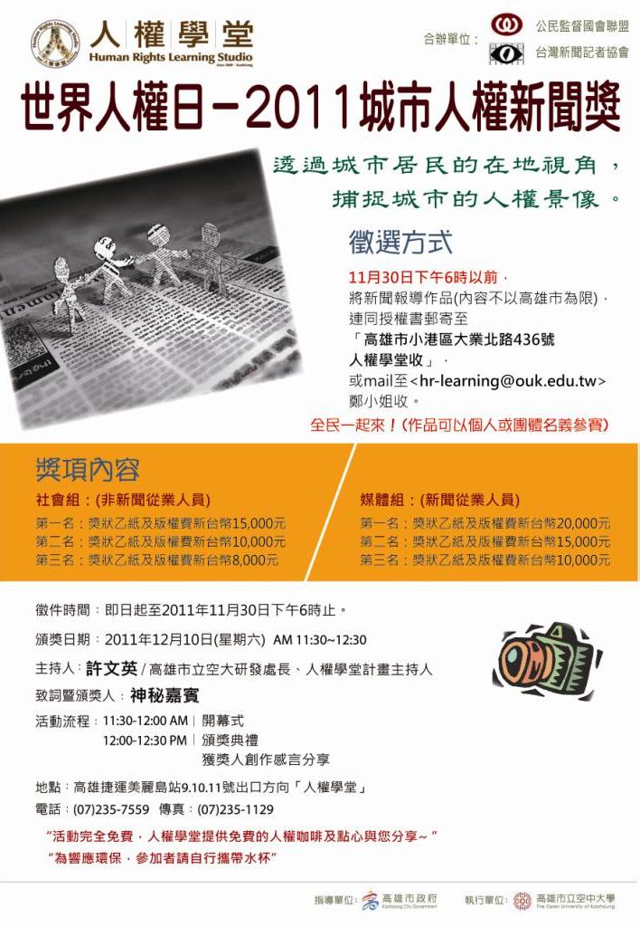 媒體資訊發達並追求經營利潤效益的全球化時代,城市人權議題未必成為媒體報導關注題材。為了讓各界更關注城市之中毎一個角落的人權議題,促進媒體發揮人權無界限之資訊傳播作用,人權學堂特別於建國百年之際,舉辦「第一屆城市人權新聞獎」活動,邀請關注人權的各界人士,即日起至11月30日止,透過城市居民的在地視角,捕捉城市的人權景像。參選之人權新聞作品經專業評審後,將於世界人權日(100年12月10日)進行頒獎。