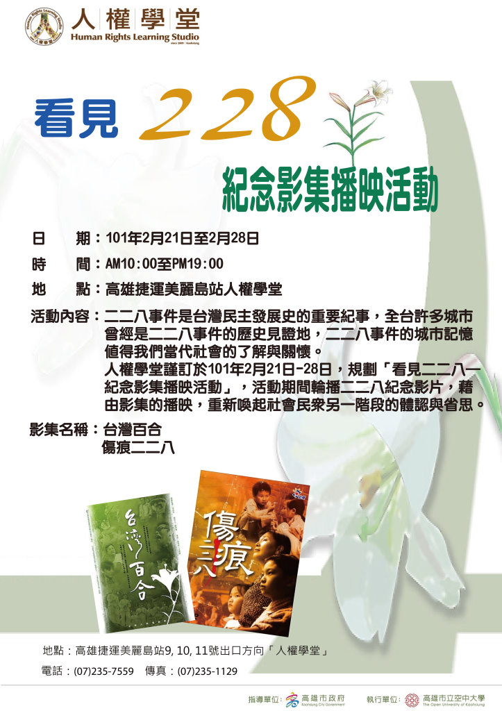 人權學堂謹訂於101年2月21日-28日,規劃「看見二二八—紀念影集播映活動」,活動期間輪播二二八紀念影片,藉由影集的播映,重新喚起社會民眾另一階段的體認與省思。