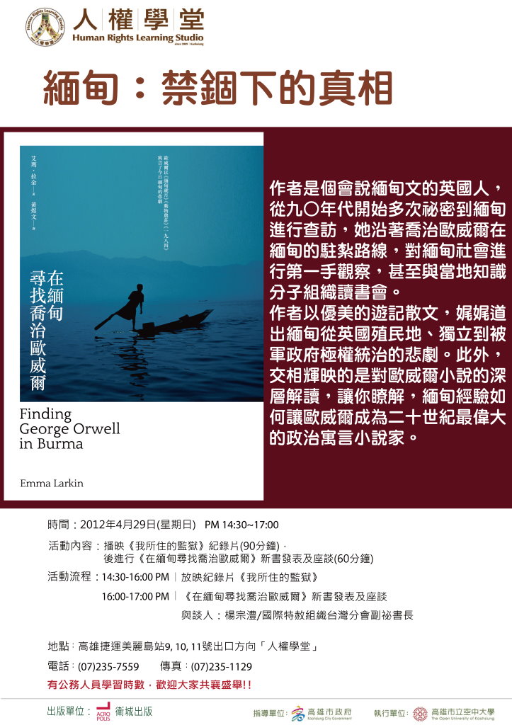 播映《我所住的監獄》紀錄片(90分鐘)後進行《在緬甸尋找喬治歐威爾》新書發表及座談(60分鐘)。