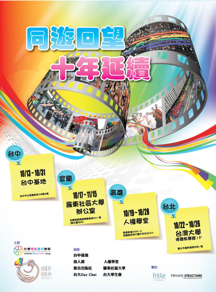 台灣同志大遊行10周年回顧攝影展 活動時間:2012/10/19(五)~2012/10/27(六) 地點:高雄捷運美麗島站9, 10, 11號出口方向「人權學堂」 主辦單位:台灣同志遊行聯盟