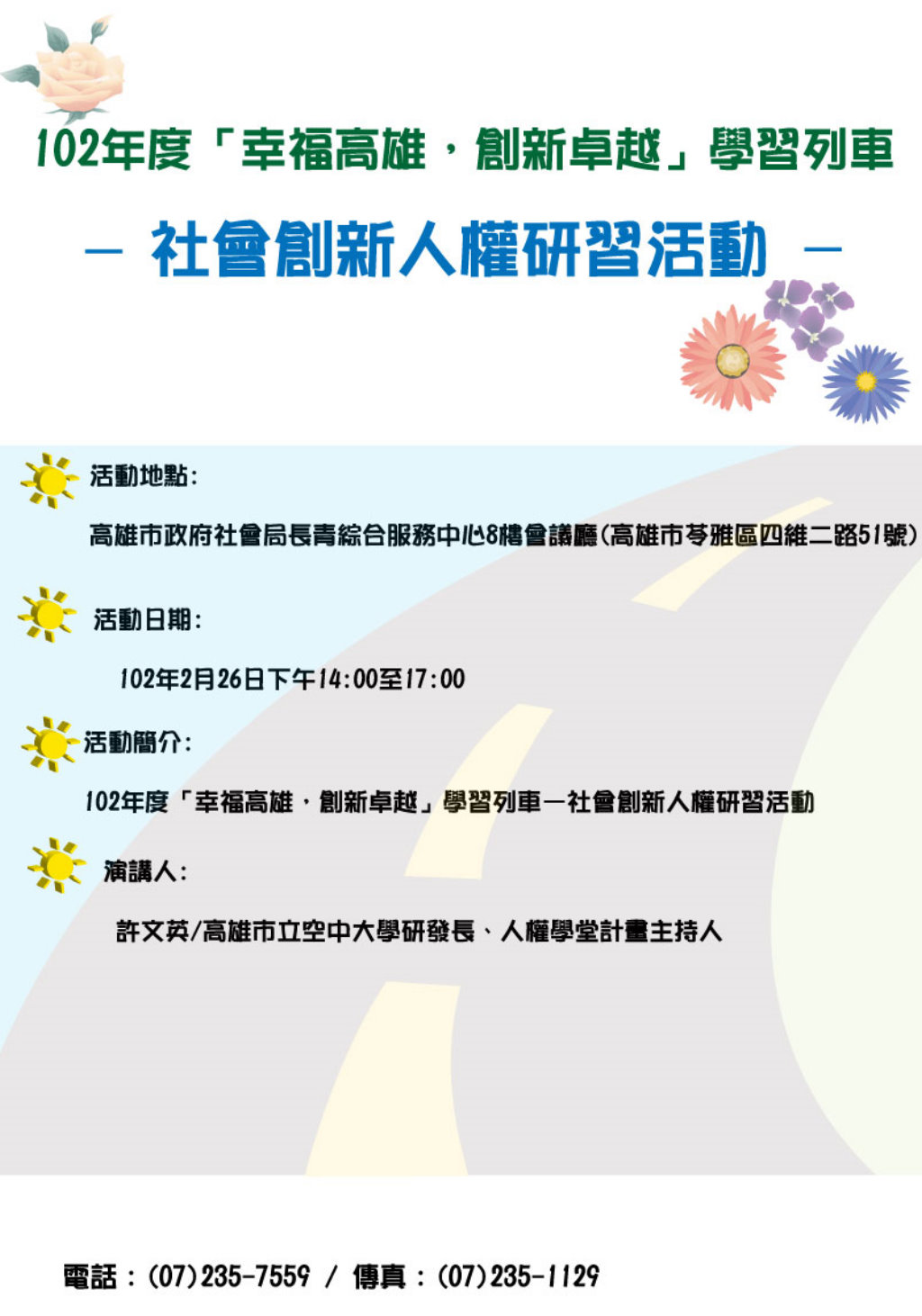 102年度「幸福高雄,創新卓越」學習列車-社會創新人權研習活動 活動時間:2013/02/26(二)pm14:00~17:00 地點:高雄捷運美麗島站9, 10, 11號出口方向「人權學堂」 電話:(07)235-7559 / 傳真:(07)235-1129 活動簡介: 102年度「幸福高雄,創新卓越」學習列車-社會創新人權研習活動