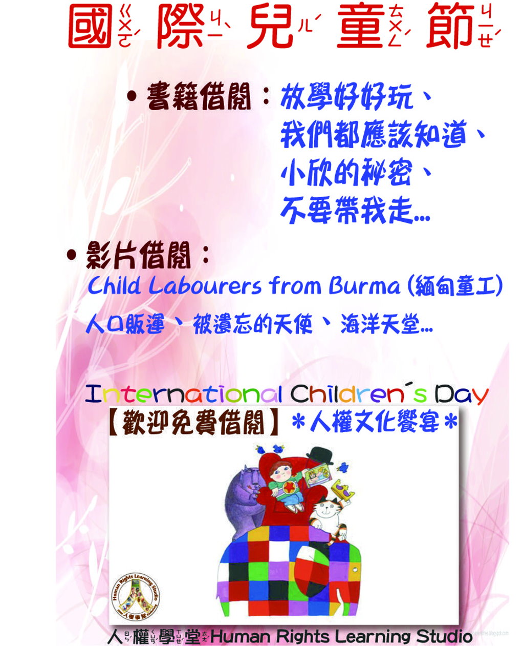 2013國際兒童節~人權文化饗宴 活動時間:2013/04/01(一)~04/14(日) 地點:高雄捷運美麗島站9, 10, 11號出口方向「人權學堂」 電話:(07)235-7559 / 傳真:(07)235-1129 活動簡介: 人權學堂謹訂於102年4月1日-14日,規劃「國際兒童節~人權文化饗宴」活動,提供民眾賞析閱讀有關促進兒童權益保障相關影片及著作,邀請社會民眾從藝術文化層面,領略兒童權益保障的內涵。