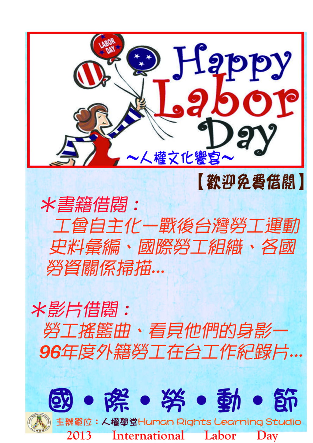 2013國際勞動節~人權文化饗宴 活動時間:2013/04/30(二)~05/12(日) 地點:高雄捷運美麗島站9, 10, 11號出口方向「人權學堂」 電話:(07)235-7559 / 傳真:(07)235-1129 活動簡介: 人權學堂謹訂於102年4月30日-5月12日,規劃「國際勞動節~人權文化饗宴」活動,提供民眾賞析閱讀有關促進勞工權益保障相關影片及著作,邀請社會民眾從藝術文化層面,領略勞工權益保障的內涵。