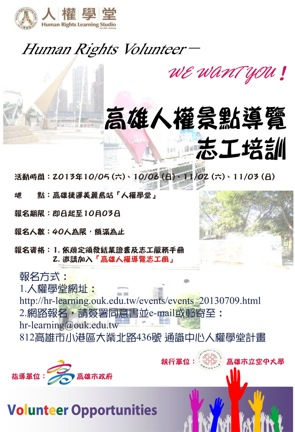 為推動學習並享受程城市人權文化、培養人權知能內涵,促進國內外人士對高雄人權文化歷史之了解,共同發展城市無煙囪工業,並帶動境外人口觀光體驗港都高雄的人權景點,使旅客能欣賞到高雄不同的歷史人文背景,舉辦『102年度高雄人權導覽志工培訓』活動,邀請各界參加人權景點導覽志工培訓,受訓結業後並邀請加入高雄人權導覽志工團,共同投入都市人權導覽志工服務行列。