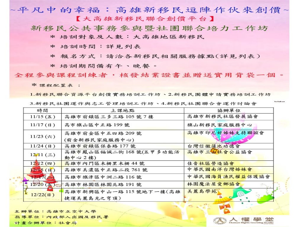 高雄市立空中大學與社會局共同主辦「新移民公共事務參與暨社團聯合培力工作坊」,歡迎推薦新移民姊妹前往參與學習,增進新移民姊妹參與公共事務的能量,或許未來也可能成為社團的幹部或人力資源等!