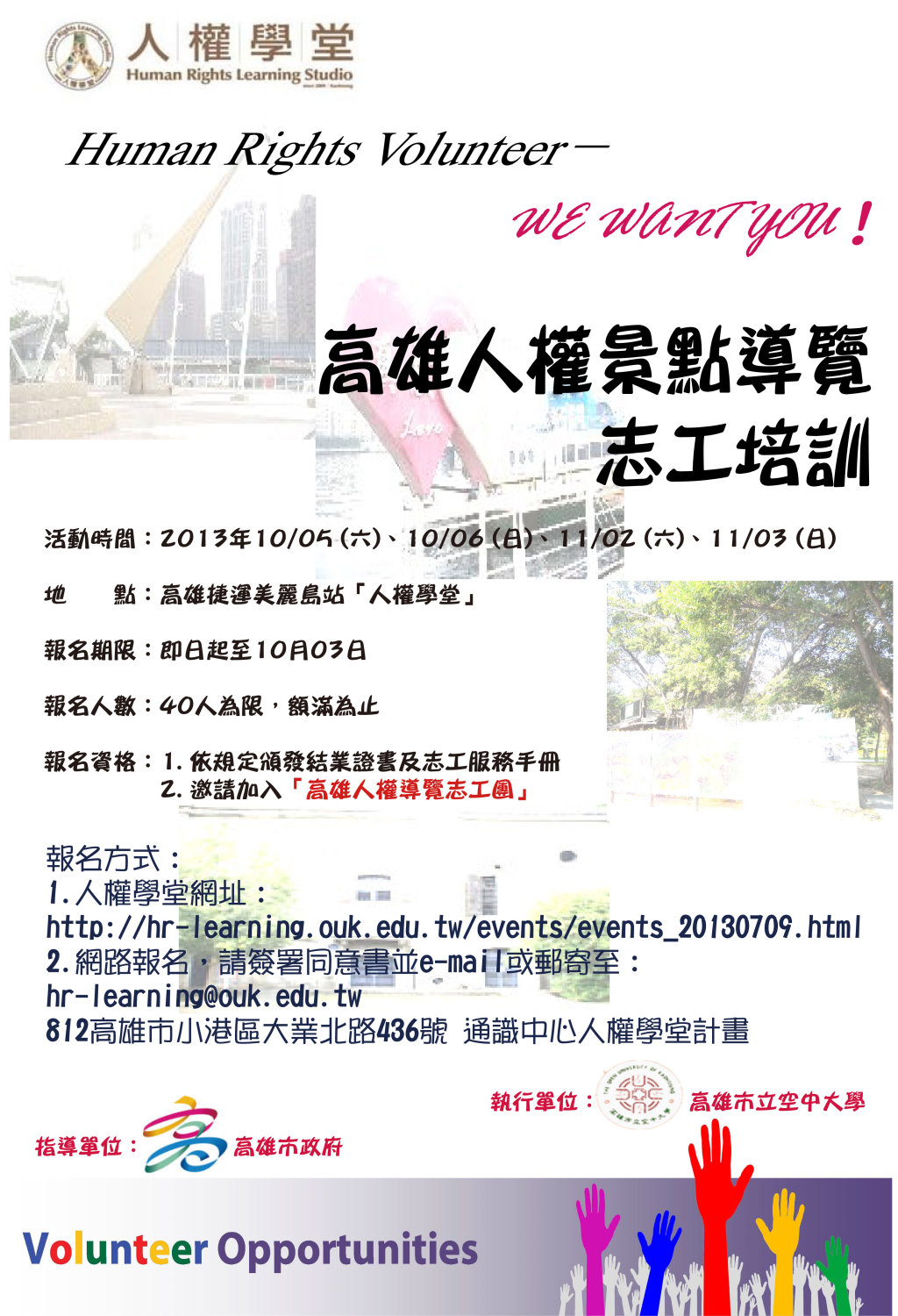 | 為鼓勵社區民眾/學生將人權知識融入日常生活之中,人權學堂特地規劃「人權學堂社區/校園巡迴講座」,以平易方式讓學社區民眾及學生了解人權與民眾生活的密切性,由學堂計畫主持人/高雄市立空中大學教授許文英進行人權教育宣導。<完整內容> |